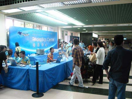 博鰲亞洲論壇2004年年會(huì)于4月24日在海南博鰲開幕。本次論壇年會(huì)主題為“亞洲尋求共嬴——一個(gè)對(duì)世界開放的亞洲”,表明2004年博鰲亞洲論壇年會(huì)將在全球背景下,探討亞洲各國(guó)和地區(qū)區(qū)域經(jīng)濟(jì)合作問題,尋求亞洲共同進(jìn)步的有效途徑。圖為忙碌的海口美蘭機(jī)場(chǎng)博鰲亞洲論壇年會(huì)接待處。(春風(fēng))