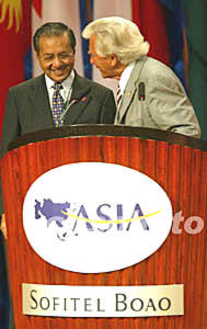 四月二十四日,馬來西亞前總理馬哈蒂爾(左)在博鰲論壇領導人峰會上發表演講后,在主持人霍克的要求下接受現場提問。中新社記者:鄭萍萍