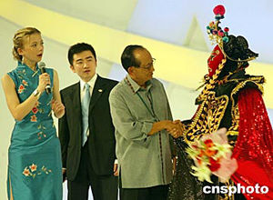 四月二十四日晚,博鰲亞洲論壇上演精彩的“亞洲文化”晚會,論壇理事長拉莫斯向中國“變臉”藝術家表示欽佩。中新社記者:鄭萍萍