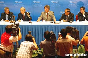 四月二十五日,龍永圖在博鰲亞洲論壇2004年會閉幕新聞發布會上表示,博鰲亞洲論壇將成為一個世界級論壇。拉莫斯(右二)、根本二郎(左二)等理事會成員出席了發布會。中新社記者:鄭萍萍