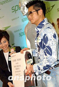 4月26日,國際游泳品牌Speedo在香港推出世界最快泳衣Speedo Fastskin FSⅡ,主禮嘉賓潭麗文女士向“香港活力動感大使”影視紅星郭富城贈送亞洲首件Speedo鯊魚泳衣。作者:洪少葵