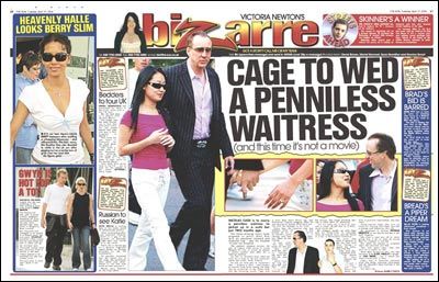 美國娛樂雜志《Bizarre》在最新一期中報道說:“尼古拉斯·凱奇將和身無分文的19歲餐廳服務生愛麗斯·金結婚。這不是電影,而是活生生的事實。”