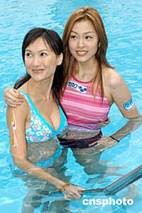 影星盧淑儀、藝員李詩(shī)蓓(右起)4月29日在香港出席國(guó)際泳裝品牌Arena 04泳裝展示派對(duì),在水中一展豐姿。作者:鄧慶樂