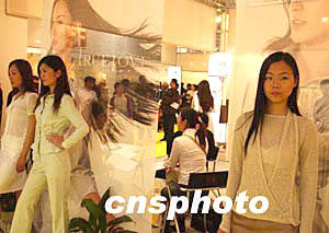 幾位身著春裝的姑娘在北京一家服裝店前擔任活動模特。今春中國氣候時冷時熱,變化異常,商家隨之推遲夏裝上市。中新社記者:賈國榮