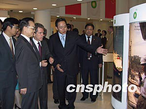 正在英國訪問的溫家寶總理9日下午前往英國石油公司參觀,正在聽取該公司總裁布朗勛爵介紹中英石油合作項目情況。朱大強 攝