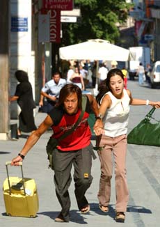 這場(chǎng)驚心動(dòng)魄的追逐戲在雅典市中心憲法廣場(chǎng)拍攝,由于現(xiàn)場(chǎng)人潮擁擠,許多人根本不曉得在拍戲,加上何潤(rùn)東與蔡琳拎個(gè)大卡行李箱,活像對(duì)亡命鴛鴦,引起很多路人側(cè)目。