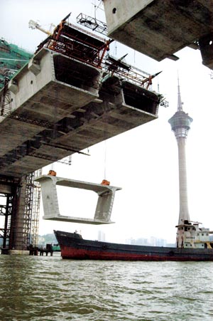 中新網5月12日電 據澳門日報報道,澳門第三大橋工程進展順利,預計主航道對上的橋面可在短期內完成。