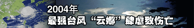 | 二○○四年第十四號臺風“云娜”于八月十二日晚間八時許在浙江臺州溫嶺石塘鎮登陸。這是這一年以來四個在中國沿海登陸的熱帶風暴中強度最強的一個,也是自一九九七年以來對浙江影響最嚴重的臺風。截至登陸當晚二 |