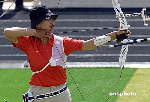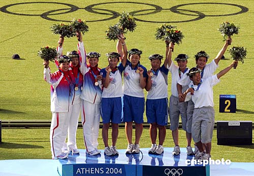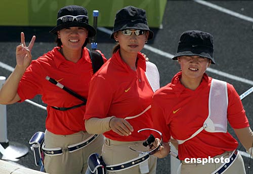 當地時間8月20日下午,中國女子射箭隊(左)獲得雅典奧運會女子射箭團體銀牌,中國臺北隊(右)獲得銅牌,實力雄厚的韓國隊奪得冠軍。中新社記者:張煒