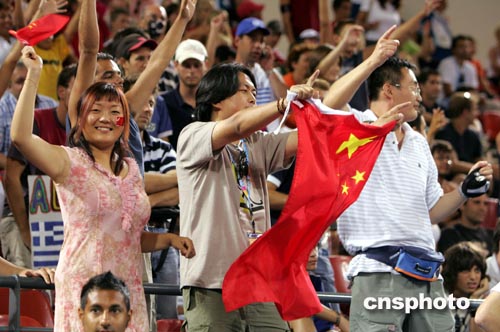 當地時間8月23日下午,中國男籃在雅典奧運會小組賽最后一場比賽中以67比66險勝世界冠軍塞黑隊,闖入前八名。圖為到場觀戰的中國球迷欣喜異常。中新社記者:任晨鳴