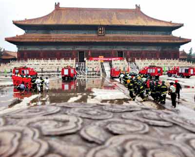 故宮消防中隊(duì)出動(dòng)兩名搶險(xiǎn)員,搶救被燒物資,同時(shí)府右街消防中隊(duì)派出兩副擔(dān)架,從殿內(nèi)“火海”中救出兩名“傷員”。花市消防中隊(duì)的數(shù)名消防員,在殿內(nèi)架起兩節(jié)梯,從內(nèi)部滅火。