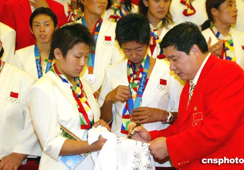 九月二日,第二十八屆奧運會中國體育代表團表彰大會在北京人民大會堂舉行,同為奧運冠軍的小將王旭、李婷向前輩王義夫求取簽名。中新社記者:鄭萍萍