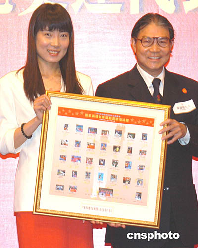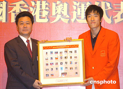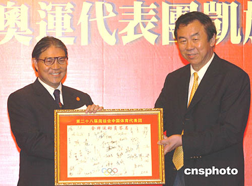 在雅典奧運(yùn)奪得首枚金牌的杜麗向霍震霆致送紀(jì)念品。