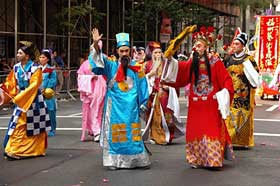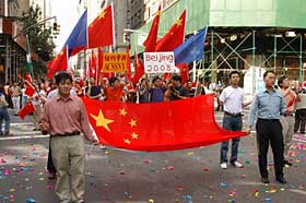 華僑華人和留學(xué)生組成了本次游行中人數(shù)最多、聲勢最浩大的隊(duì)伍,不但有舞龍、舞獅、鑼鼓,還有腰鼓、秧歌以及表現(xiàn)中國京劇藝術(shù)、少數(shù)民族服裝等傳統(tǒng)文化的表演分隊(duì),許多路邊的觀眾也揮動中國國旗并熱烈鼓掌。