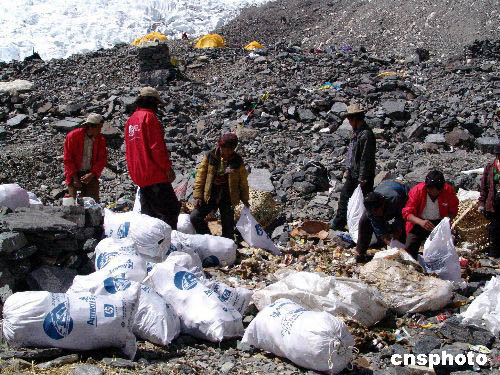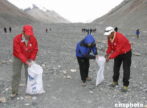 參加由西藏自治區體育局與中國科學探險協會聯合主辦的“2004地球第三極珠峰環保大行動”的二十四名志愿者,九月上旬與西藏登山協會的專業登山隊員一起,克服珠峰地區高寒、狂風、缺氧、低壓等惡劣的自然環境,對留存在海拔高度5100米-6500米的珠峰廢棄物進行為期三天的全面清掃工作。