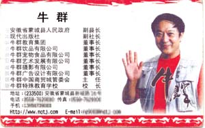據介紹,根據中紀委、中組部的通知要求,2004年4月底以前完成對黨政領導干部在企業兼職問題的清理工作,嚴禁各級黨政領導干部在企業兼職。但是目前,牛群依然是蒙城縣副縣長。9月8日,記者從蒙城縣工商局了解到,牛群依然擔任著包括“蒙城五子牛教育有限公司”在內的四五家企業的法人代表。
