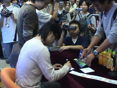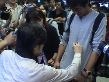 當彭坦小心翼翼的剛把腳邁出休息室走向簽售區那一刻時,還是被明眼的歌迷發現。“天啊,彭坦在那!”于是達達樂隊4個人基本上是飛快跑到簽售臺的,四個帥小伙的出現引起了現場不小的騷亂。人群涌動,好多小女生興奮異常。