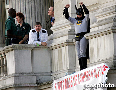 這名抗議者詹森·哈奇,今年32歲,是英國維護(hù)父權(quán)組織“為父親討公道(Fathers 4 Justice)”的一名成員,他扮成蝙蝠俠模樣,闖入女王伊麗莎白二世居住的白金漢宮,爬上宮殿正面一個陽臺,又從陽臺走到危險的墻檐上,引來大群圍觀者。大為尷尬的白金漢宮安全官員當(dāng)天晚上即對此事展開調(diào)查。