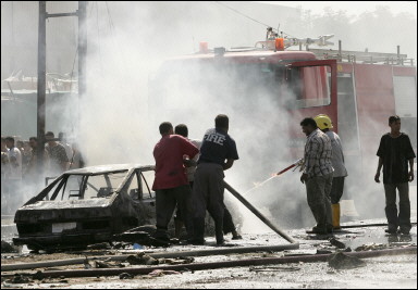 警局前的大街上布滿了玻璃碎片,上空濃煙彌漫,地上可以看到多塊尸體碎塊。警方消息稱,爆炸造成至少10人死亡,數十人受傷。