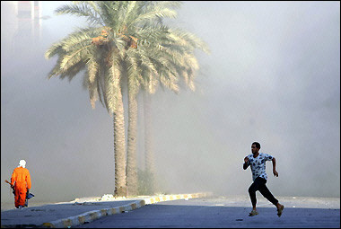 中新網9月14日電 據法新社報道,9月13日,在伊拉克首都巴格達,一名男子逃離市中心海法大街上發生的激烈沖突,另一名伊拉克清潔工則在大街上平靜地走著。巴格達市中心地帶一度被視作薩達姆支持者的根據地,盡管這里高樓林立,但駐伊美軍經常會和支持薩達姆的游擊隊發生沖突,而這次的交火相當激烈。(固山)