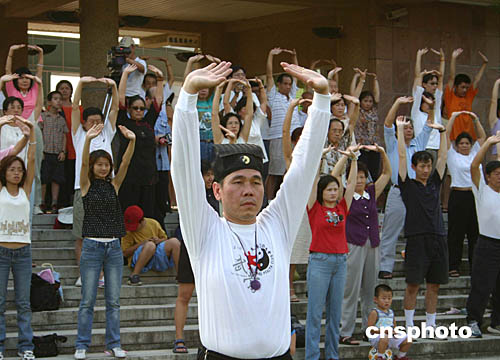 除了表演外,兩岸武當高手們今天還現(xiàn)場傳授武當養(yǎng)生功法。這套源自于六百年前,由武當派祖師張三豐所創(chuàng)的太極拳法,化有形為無形,最具道家武術精髓,被稱為“內(nèi)家的祖庭”。在教練的帶領下,只見全場民眾起立,微屈雙膝,徐展臂掌,吐故納新。