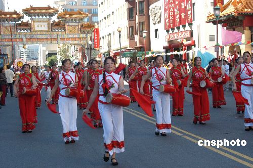 二零零四年華盛頓中國文化節九月十九日在華盛頓唐人街舉行。身著民族服飾的東方女子敲起腰鼓,別有風韻。 作者:余東暉