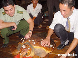 這只雌性綠海龜體長1.1米,寬0.8米,重達83公斤,背面及腹面角板均有色澤的斑紋,表面呈橄欖色,并有多種貝殼化石附著點綴其間,煞是好看。據水產部門介紹,該海龜系國家二級重點保護水生野生動物,主要分布于中國臺灣、福建和海南等沿海一帶海域。作者:陳如冰