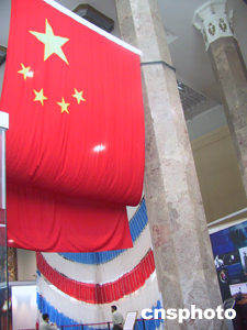 圖為“神舟”五號飛船搭載的五星紅旗,其后蘭白紅相間的巨大降落傘是“神舟”五號飛船返回著陸時使用的主降落傘。