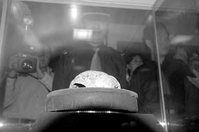 據(jù)北京娛樂信報報道,30日上午10時30分左右,在數(shù)名手持沖鋒槍的房山公安分局防爆隊隊員的嚴密監(jiān)視下,北京人頭蓋骨枕骨化石從中科院安然運抵周口店北京人遺址博物館,被安放在防彈玻璃罩中展出,這次展出將持續(xù)到10月14日。