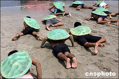 動物保護(hù)組織扮海龜在海灘爬行