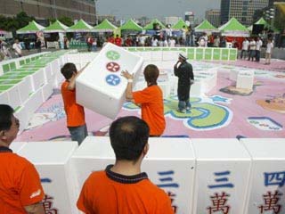 中新網(wǎng)10月9日電 臺北一家網(wǎng)絡(luò)麻將游戲公司今日舉辦了一場別開生面的超級大麻將比賽,參賽者必須使用90厘米長、60厘米寬及50厘米高的麻將一決勝負(fù),第一名將獲得獎(jiǎng)金新臺幣1萬元。