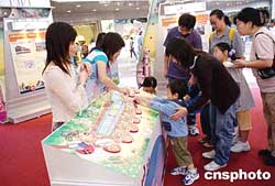 香港九廣鐵路周日在時代廣場舉辦展覽,推介馬鞍山、尖沙嘴新支線,進一步拓展鐵路網絡,計劃在2004年底落成。圖為市民參觀展覽。作者:洪少葵