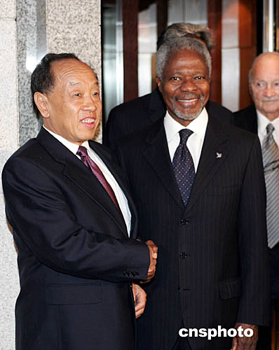 中新網10月11日電 據新華網報道,聯合國秘書長科菲·安南11日在京向中國外交部長李肇星致謝,贊賞中國維和人員在參與聯合國維和行動中表現出的專業精神和良好素質。