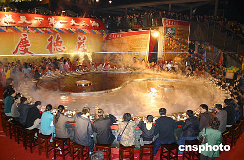 萬人品嘗重慶火鍋活動是第五屆中國美食節暨首屆重慶國際火鍋文化節的重頭戲。本屆美食節組委會成員、重慶市商業委員會主任秦文武說,來自重慶市的近七十家餐飲企業聯手奉獻了九百余桌火鍋。上萬人同席共燙火鍋的壯觀場面,還是有史以來第一次。