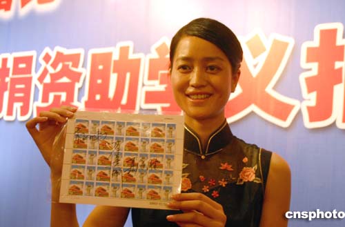 “神舟”五號飛船搭載紀念郵票將于今年年底在成都拍賣,拍賣所得傭金將全部捐助西部教育事業。“神舟”五號搭載紀念郵票是隨“神舟”五號一起遨游太空的唯一三個整版,中國航天員楊利偉、聶海勝、翟志剛三人在郵票上親筆簽名。圖為禮儀小姐展示其中一個整版。作者:郭晉嘉