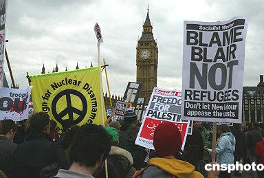 示威者高舉的大型標(biāo)語(yǔ)就不下數(shù)百,其中有“我們要和平,不要戰(zhàn)爭(zhēng)”;“撤回駐軍”;“停止以色列恐怖主義,解放巴勒斯坦”;“打倒工黨帝國(guó)主義”“打倒布什”以及“布萊爾必須下臺(tái)”等等。