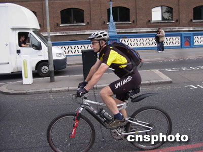 倫敦狹窄的馬路常常并不劃出專門的自行車道,即使有,只是用白線隔出的一條僅容一輛自行車騎行的細(xì)徑。也許是得益于這里良好的交通秩序和公眾的交通意識(shí),人們騎車的速度一般都很快,堪稱“飆車”,雖然沒見到誰出現(xiàn)閃失,但其速度也令記者們暗暗捏一把汗。