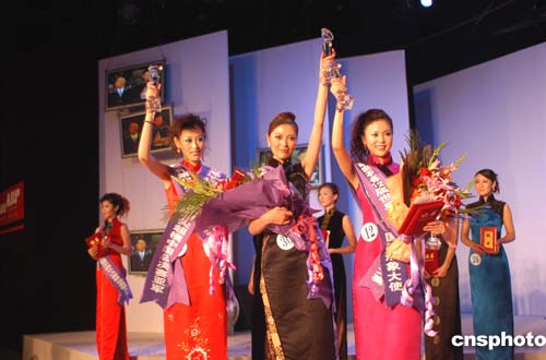 來自湖北賽區的選手孫娜(中)摘取了“二00四中國頂尖超模”的桂冠,山東賽區選手王琦(左)和北京賽區選手張莘苗分獲亞軍、季軍。作者:鄢來雄