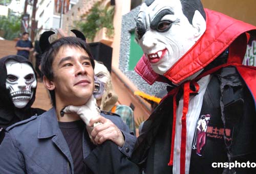 萬圣節將臨,香港尖沙咀最新型人蒲點的諾士佛階,二十日率先展開迎接萬圣節活動,圖為扮成嘩鬼的男士與出席活動的男模吳嘉龍做戲。作者:錢興強
