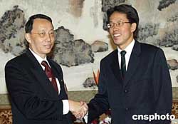 十月二十一日,國務院港澳辦副主任張曉明(右)在北京國賓館會見了由陳景生率領的香港大律師工會訪華團。作者:史利