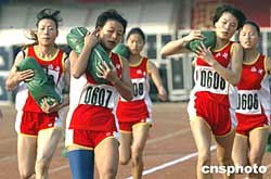 田徑比賽中的六十米五人抗洪搬沙包賽也顯示出了農運會貼近農民生活的特色,圖為女子六十米五人抗洪搬沙包賽中福建的五位參賽選手奮勇爭先。作者:盛佳鵬