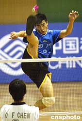 在毽球比賽中,精彩場面不斷呈現。圖為男子單打比賽中四川參賽選手躍起進攻。作者:盛佳鵬
