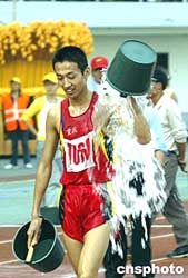 五分鐘五十米抗旱提水保苗賽跑成為一個特色的比賽項目,同時也是和農民生活非常接近的一個比賽項目,要求參賽選手在規定的時間內盡可能多的提水。圖為一位順利完成比賽的選手將水桶里的水倒在身上慶祝。作者:盛佳鵬