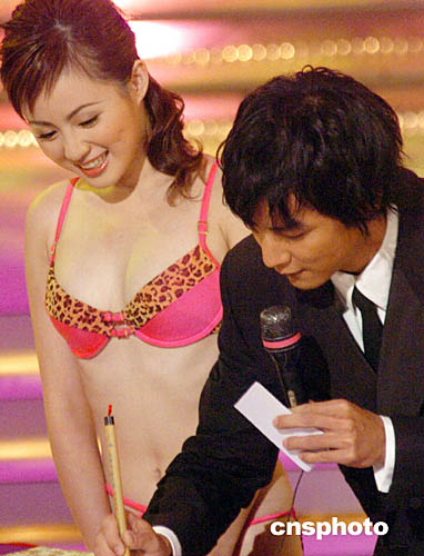 2004亞洲小姐競選總決賽,于十月二十四日晚在香港演藝學(xué)院舉行,司儀吳彥祖即興為杭州佳麗呂晶晶書寫電話號(hào)碼。中新社記者:錢興強(qiáng)