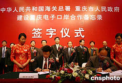海關(guān)總署總工程師楊國勛和重慶市副市長吳家農(nóng)今天在備忘錄上簽字。這標(biāo)志著重慶電子口岸建設(shè)正式啟動。