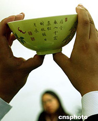 北京華辰十一月秋季將拍賣一件最高品級(jí)的清雍正黃地琺瑯彩題詩(shī)碗,堪稱收藏界麟角難覓之器,自今難以估價(jià)。中新社記者:賈國(guó)榮