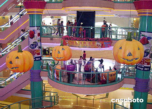 萬圣節臨近,南瓜是萬圣節的主要裝飾。圖為香港九龍城廣場也點綴了以南瓜鬼臉飾物應節。作者:譚達明