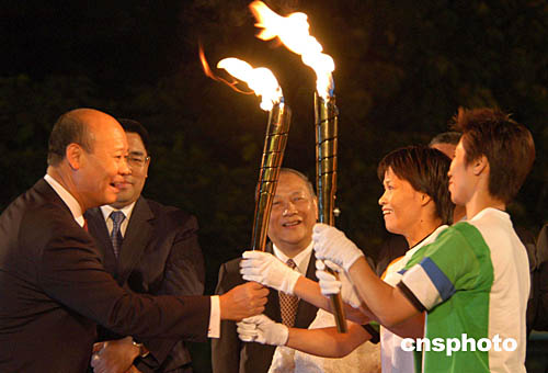 澳門特首何厚鏵在金蓮花廣埸接過中國雅典奧運金牌得主勞麗詩和澳門運動員李廣祥傳遞的“開元”之火火炬