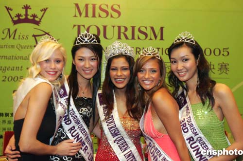 由中國全國工商聯旅游業商會主辦的二零零五年國際旅游小姐冠軍總決賽新聞發布會十月三十一日在北京舉行,獲得二零零四年國際旅游小姐總決賽前三名的選手(左三印度小姐ZABINAABDULRASHIDKHAN、左四德國小姐JOHNALENAKWASOW、左二中國小姐鈔俊男)等美女亮相人民大會堂,為開始啟動的二零零五年國際旅游小姐大賽助興。作者:毛建軍