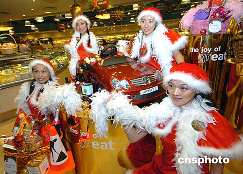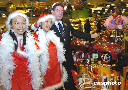 香港一家外國公司11月4日在香港太古廣場由圣誕俏女郎陪伴推出價值8﹐888元的圣誕跑車禮物籃。